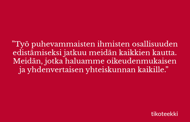 Vaikka nyt jään pois tästä tehtävästä, työ puhevammaisten ihmisten osallisuuden edistämiseksi jatkuu. Se ei jatku vain yhden ihmisen, yksikön tai organisaation kautta. Työ puhevammaisten ihmisten osallisuuden edistämiseksi jatkuu meidän kaikkien kautta. Meidän, jotka haluamme oikeudenmukaisen ja yhdenvertaisen yhteiskunnan kaikille.